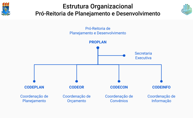 A PROPLAN é formada pela Secretaria Executiva e 4 (quatro) coordenações: Coordenação de Planejamento (CODEPLAN), Coordenação de Orçamento (CODEOR), Coordenação de Convênios (CODECON) e Coordenação de Informação (CODEINFO). A estrutura organizacional e funcional da pró-reitoria está estabelecida no seu Regimento Interno. A seção apresenta informações sobre o organograma, as unidades organizacionais e a fundamentação legal da Pró-Reitoria.