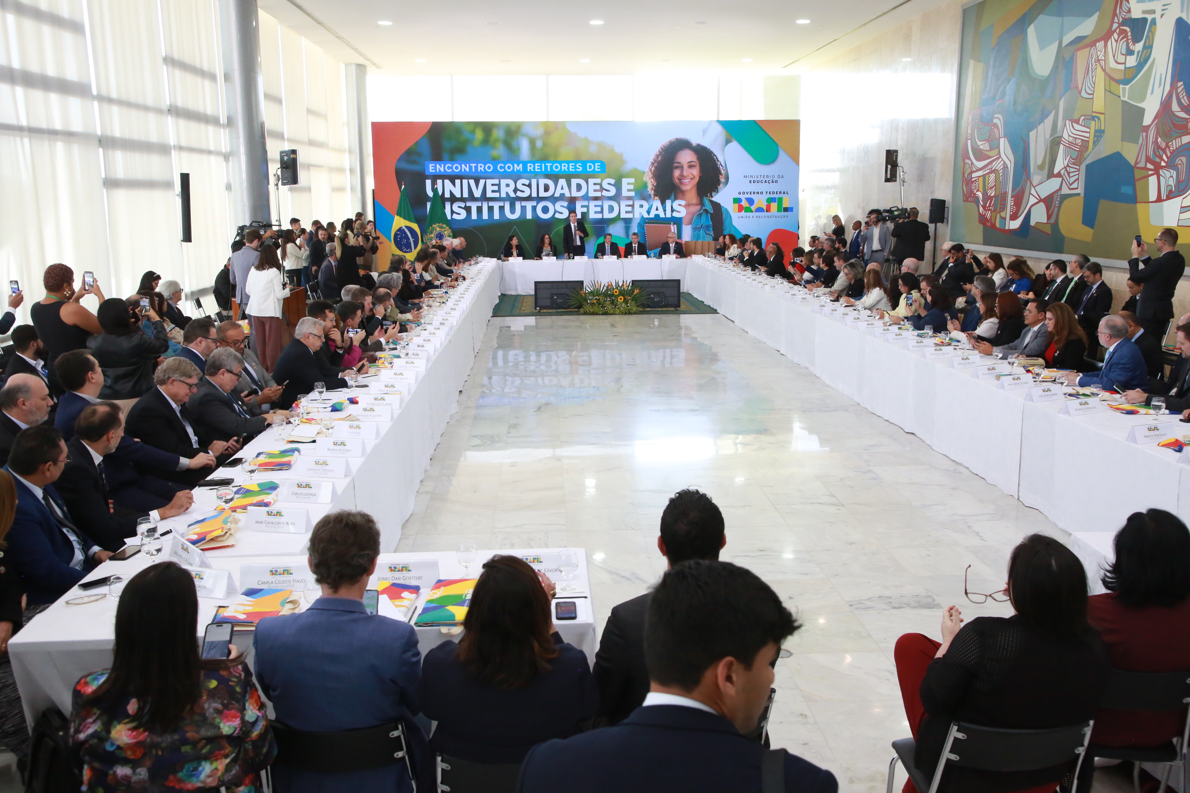 A reitora da Universidade Federal da Paraíba (UFPB), Terezinha Domiciano, participou hoje (27.05), no Palácio do Planalto, em Brasília, de encontro com reitores e reitoras de Instituições de Ensino Superior (IES) federais, como universidades e institutos federais de ensino, do qual participaram também autoridades como o ministro da Educação, Camilo Santana, o ministro da Fazenda, Fernando Haddad, e a ministra da Ciência, Tecnologia e Inovação, Luciana Santos.